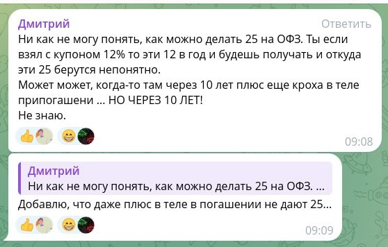 Идея сработает, если ЦБ понизит ставку до 12% (и сохранит план по дальнейшему снижению). ОФЗ 26248 - SU26248RMFS3: Представим, что ставка ЦБ стала 12%. И ЦБ обещает дальше понижать. Доходность к погашению ОФЗ должна уйти ниже ставки ЦБ, Тело должно вырасти до 105% (ну или смотря какой спред со ставкой ЦБ будет). И купоны сверху. Ваши "лайки" - лучшая обратная связь для автора блога! Чуть раньше статьи выходят в Телеграм