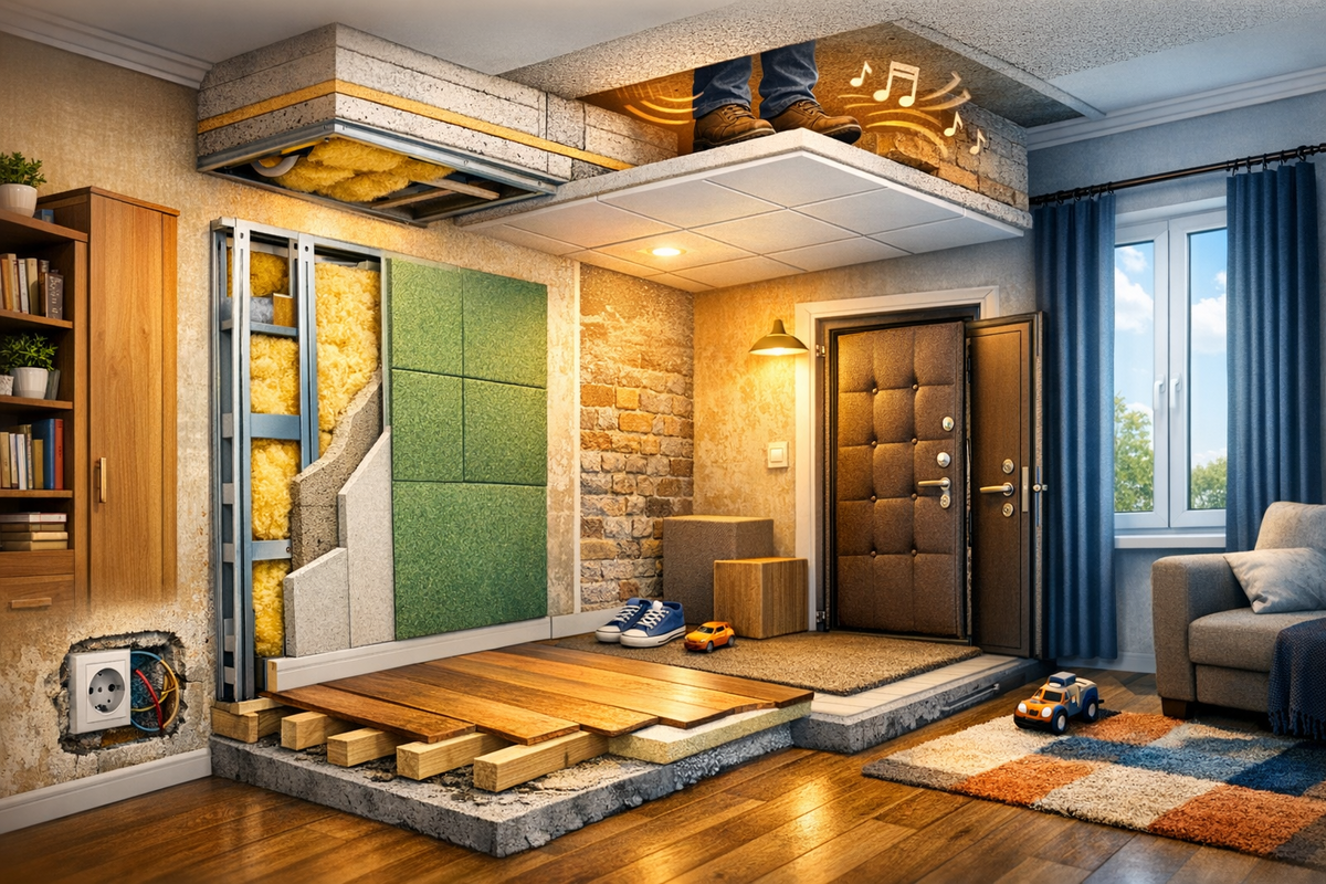 Есть вещи, которые невозможно контролировать. Погода, пробки, соседи. Но если с первыми двумя приходится мириться, то с третьим — можно что-то сделать. Особенно если главная проблема — шум. Ковры на стенах, конечно, давно остались в прошлом. Но идея-то была правильная: мягкие поверхности гасят звук. Сейчас для этого есть куда более приличные решения — и для стен, и для пола, и для потолка. Самый надёжный вариант — возвести перегородку. Звучит пугающе, но на практике это металлический каркас, внутри которого укладывают минеральную акустическую вату, а снаружи зашивают гипсокартоном. Получается слоёный пирог, который неплохо держит звук. Плюс — заодно утепляет. Минус — съедает несколько сантиметров комнаты. Если квартира и так небольшая, это чувствительно. Альтернатива — звукоизоляционные панели. Их можно закрепить не по всему периметру, а только на одной проблемной стене и оформить как декоративный элемент. Никто и не догадается, что за красивой панелью — слой шумоизоляции. Ещё один бюд