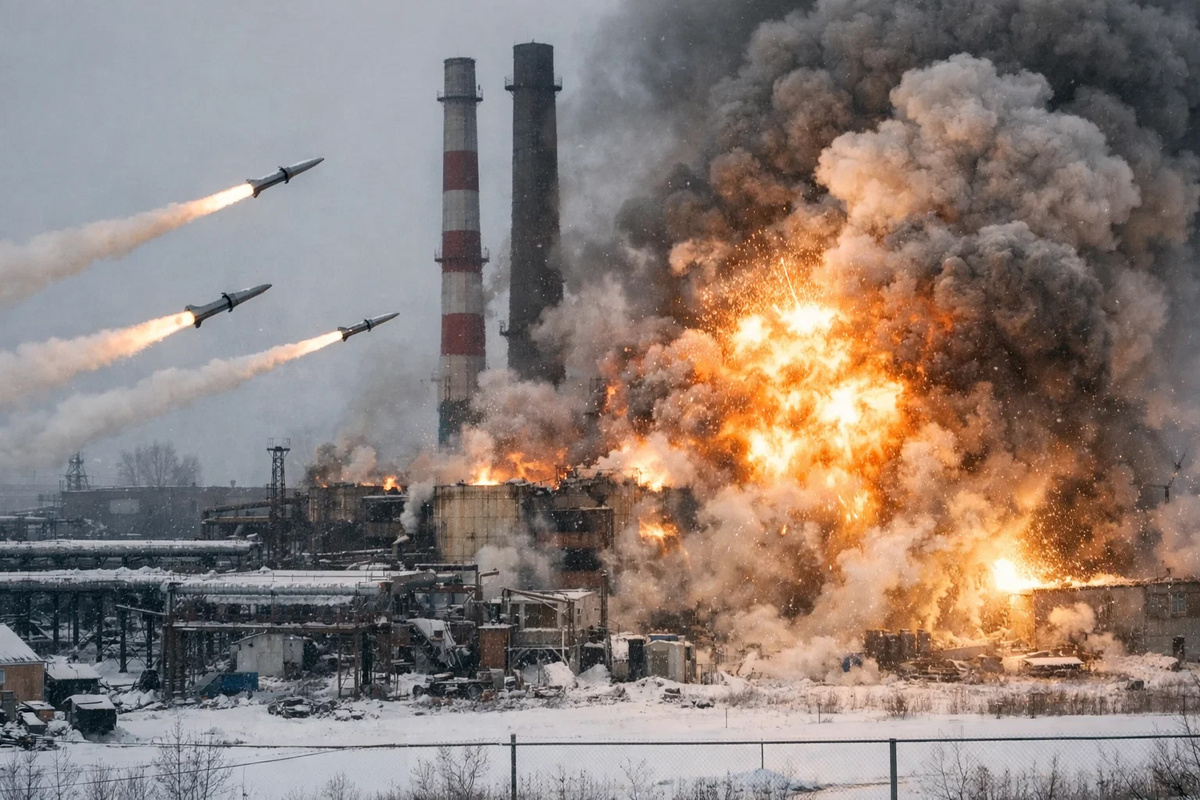 Ну наконец-то — кузькина мать! Русская армия бахнула мощно — столбы огня, пылает самая большая котельная