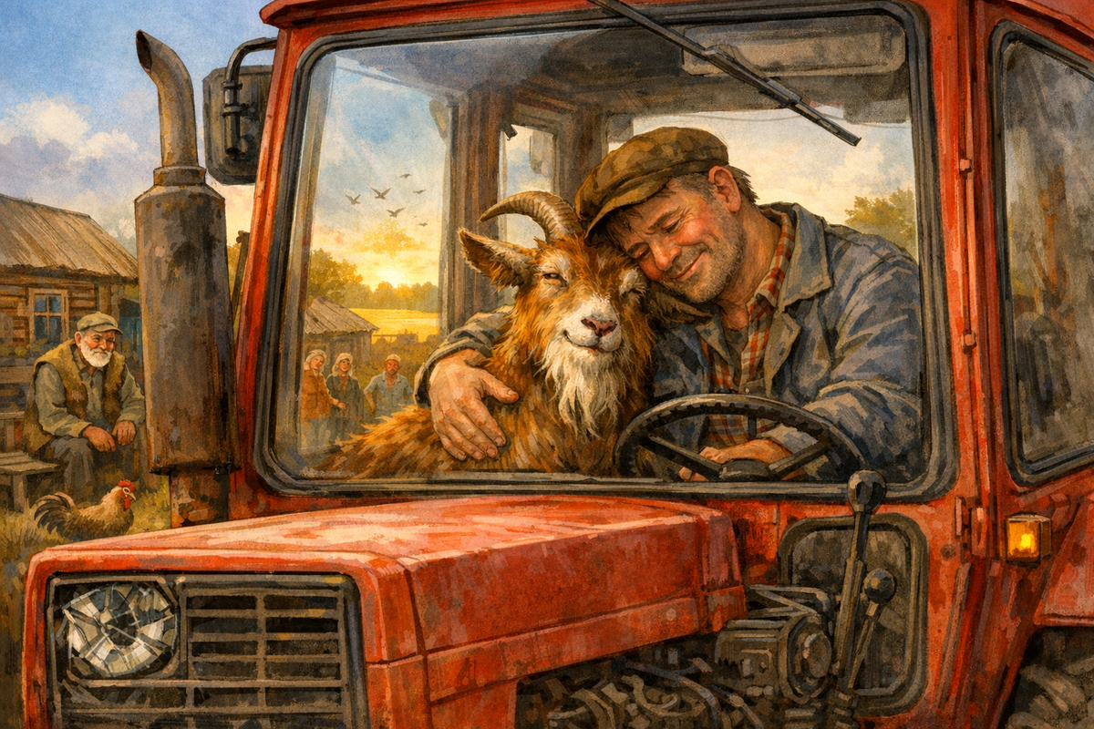 За деревней начиналось поле. Колька решил сделать круг и вернуться. Но когда он выехал на просёлок, случилось странное. Козёл перестал блеять. Он бежал ровно, в такт трактору, и морда у него была не страдальческая, а какая-то... счастливая.