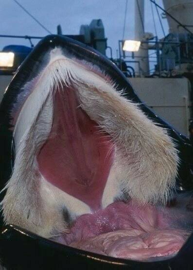 » То, что видно в их пасти, называется китовым усом. Это роговые пластины из кератина — того же материала, из которого состоят человеческие ногти и волосы Такое строение характерно для усатых китов — например, у Синего кита или Горбатого. Вместо зубов у них свисают плотные пластины с бахромой по краям. Именно эта «бахрома» и напоминает густые жёсткие волосы Китовый ус работает как природный фильтр. Основная пища морских гигантов — крошечные планктонные организмы и мелкая рыба, которых порой не разглядеть невооружённым глазом. Охотиться за каждым рачком бессмысленно. Поэтому кит действует иначе: раскрывает пасть и заглатывает огромный объём воды — за один раз это может быть от 40 000 до 80 000 литров. Затем он выталкивает воду обратно, и она проходит через роговые пластины. Жидкость свободно уходит, а планктон и мелкая рыба застревают в «щётке» из китового уса За один такой заход в пасти может остаться около 10 килограммов корма. После этого киту остаётся лишь проглотить добычу — и