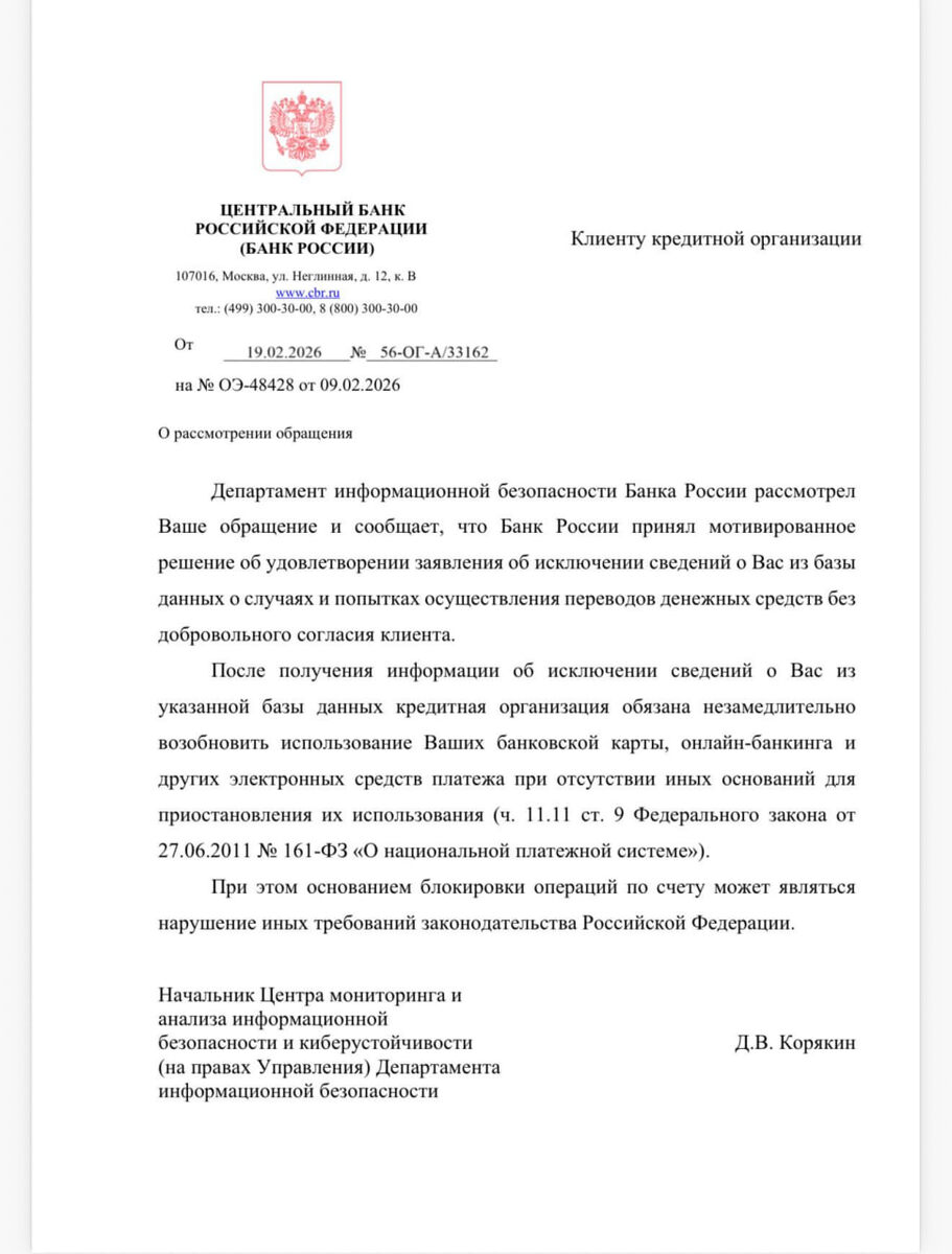 У нас тут маленькая победа об исключении данных нашего заказчика из реестра ЦБ при блокировке карт, после понуждения Сбербанка в досудебном
