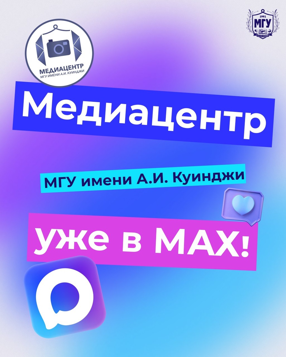И. Куинджи — уже в МАХ! 😳 Закулисье съемок, живые репортажи, фото с мероприятий и студенческий взгляд на университетскую жизнь — все это уже в МАХ. ❤️ Подписаться на Медиацентр МГУ имени А.И. Куинджи в МАХ ⭐️ Будьте в центре событий со студенческим Медиацентром университета! 👻 MAX|💙ВК|📝Дзен|🤩Сайт #МГУимениКуинджи