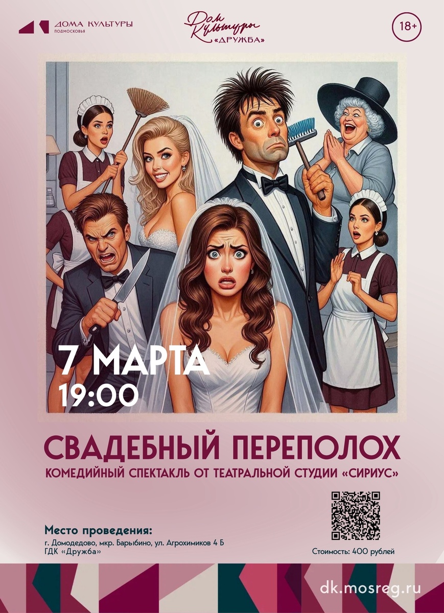 ✨ 🎭 ПРЕМЬЕРА комедийного спектакля «Свадебный переполох» Театральная студия «Сириус» представляет… Рано или поздно в жизни каждого наступает важнейшее событие, к которому иногда просто невозможно подготовиться.... Уж очень сообразительный парень Билл сегодня решил связать себя узами брака с педанткой Рейчел. «Свадьба с обложки» - лозунг предстоящего празднества. Меню, декор, рассадка гостей и даже место проведения - всё расчитано до мельчайших деталей, осечка просто невозможна! Но вот не задача.... 🚫 Возраст: 18+ 📆 07.03.2026🕒19:00 🏢 Городской дом культуры «Дружба» 📍 г.о. Домодедово, мкрн.Барыбино, улица Агрохимиков, д.4Б 🎫 Купить билет: https://iframeab-pre5158.intickets.ru/event/70503742/ ✅ Мероприятия Домодедово https://dzen.ru/id/66f10385cc4c5a16f7b5fb02 http://vk.com/domodedovo_events http://dzen.ru/domodedovo_events