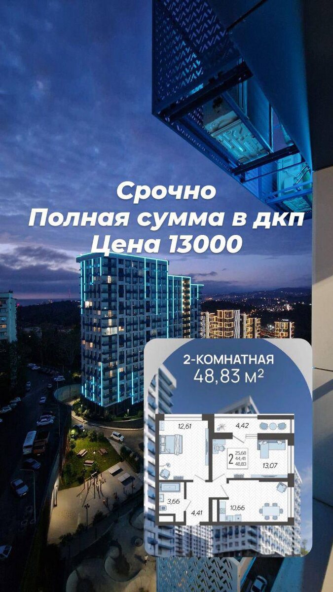 🔥 КВАРТИРА УЙДЁТ САМОМУ БЫСТРОМУ В ЗА НЕСКОЛЬКО ЧАСОВ 🤩 💥Бизнес-класс 💥48 м² | 15 этаж 💥Планируется в две спальни и кухню 💥 Вид на море 💥 Полная сумма в договоре Цена ниже рыночной — почти за даром🎁 Рынок: 16,5 млн Наша цена: 13 млн Ваша выгода: 3,5 млн ⚡️ ✅Статус: квартира ✅ФЗ-214 | полный пакет документов ✅Юридическая чистота сделки ✅Надёжный застройщик О комплексе: -ландшафтное озеленение🌿 -спортивные площадки🏋️♂️ -закрытая территория -школа и детский садик -коммерция на территории Локация + удобство: -один из самых популярных районов Сочи🌴 -удобная транспортная развязка -хорошие дороги -шикарные виды✨ -супермаркеты, аптеки, пункты выдачи — всё рядом👌 Один из самых продаваемых и желанных ЖК🔥 Подходит для инвестиций и пассивного дохода💸 🔥Такие варианты по такой цене долго не живут — их забирают первыми🔥 БРОНИРУЙ ПРЯМО СЕЙЧАС!!!💣 ВЫШЛЮ ИНФОРМАЦИЮ МГНОВЕННО 🏎️ Телефон 89189097266 Вадим