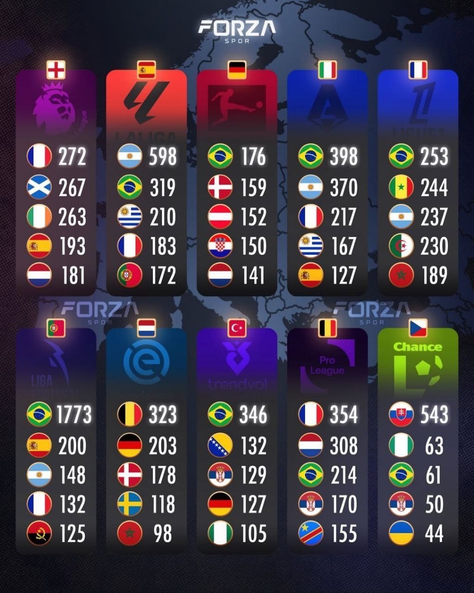 На удивление, бразильцы доминируют с большим отрывом только в Португалии, но это связано с тесными связями двух стран (обратим внимание и на Анголу). Во многом этим объясняется и большое количество аргентинцев в Италии и Испании - редко, когда у аргентинцев нет второго гражданства из этих стран. ➡ А вот такие расклады по самым частым иностранным игрокам в ТОП-10 лиг в сезоне 2025-26: 🏴 АПЛ: Франция - 37 🇪🇸 ЛаЛига: Аргентина - 29 🇩🇪 Бундеслига: Австрия - 27 🇮🇹 Серия А: Франция - 29 🇫🇷 Ligue 1: Сенегал - 28 🇳🇱 Эредивизие: Бельгия - 20 🇵🇹 Премьер-Лига: Бразилия - 100 🇹🇷 Süper Lig: Бразилия - 24 🇧🇪 Про Лига: Франция - 39 🇨🇿 Шанс Лига: Словакия - 48 Судя по статистике, французские футболисты всё чаще пользуются спросом. Конечно, уж место чехов в ТОП-10 лиг Европы обязана была бы занимать РПЛ. Поэтому вот самые популярные иностранцы в этом сезоне от нашей лиги: Бразилия - 29 Сербия - 15 Аргентина - 10 Босния и Герцеговина - 9 Италия - 9 (все 9 игроков италь