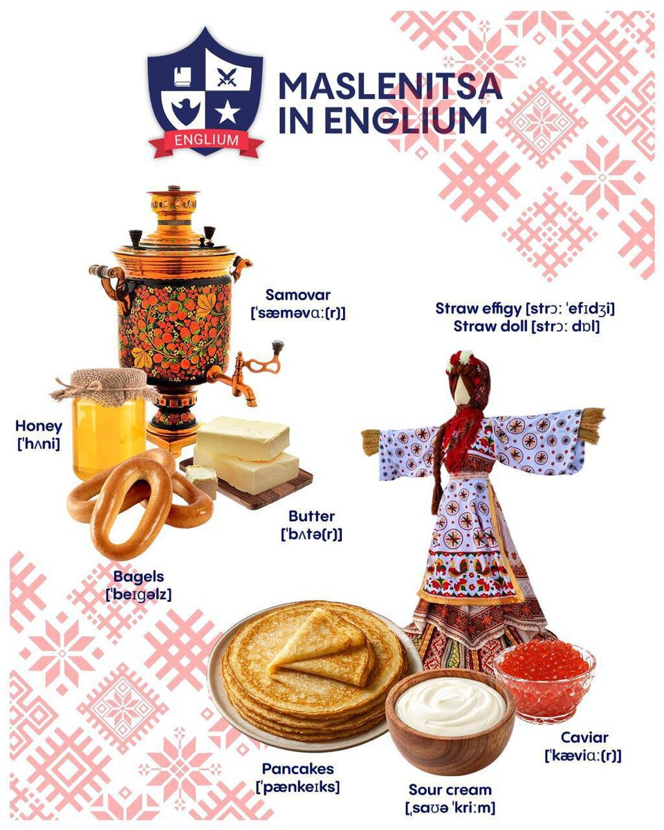 🥞 Масленица — время блинов и весеннего настроения! А мы решили совместить традиции и английский язык💙 Сохраняйте пост — пригодится для мини-домашней языковой практики. Вот несколько слов, которые можно выучить всей семьёй: • Блины — Pancakes [ˈpænkeɪks] • Масло — Butter [ˈbʌtə(r)] • Мёд — Honey [ˈhʌni] • Баранки — Bagels [ˈbeɪɡəlz] • Самовар — Samovar [ˈsæməvɑː(r)] • Сметана — Sour cream [ˌsaʊə ˈkriːm] • Икра — Caviar [ˈkæviɑː(r)] • Чучело Масленицы / чучело зимы — Straw effigy [strɔː ˈefɪdʒi] или Straw doll [strɔː dɒl] Можно предложить ребёнку простое задание: попробовать составить 1–2 предложения: — I like pancakes with honey. — We eat pancakes with sour cream and caviar. — There is a samovar on the table. — Maslenitsa is a spring festival. Небольшая игра — а польза большая: новые слова запоминаются через эмоции и традиции! Уже все поели блинов? 🥞