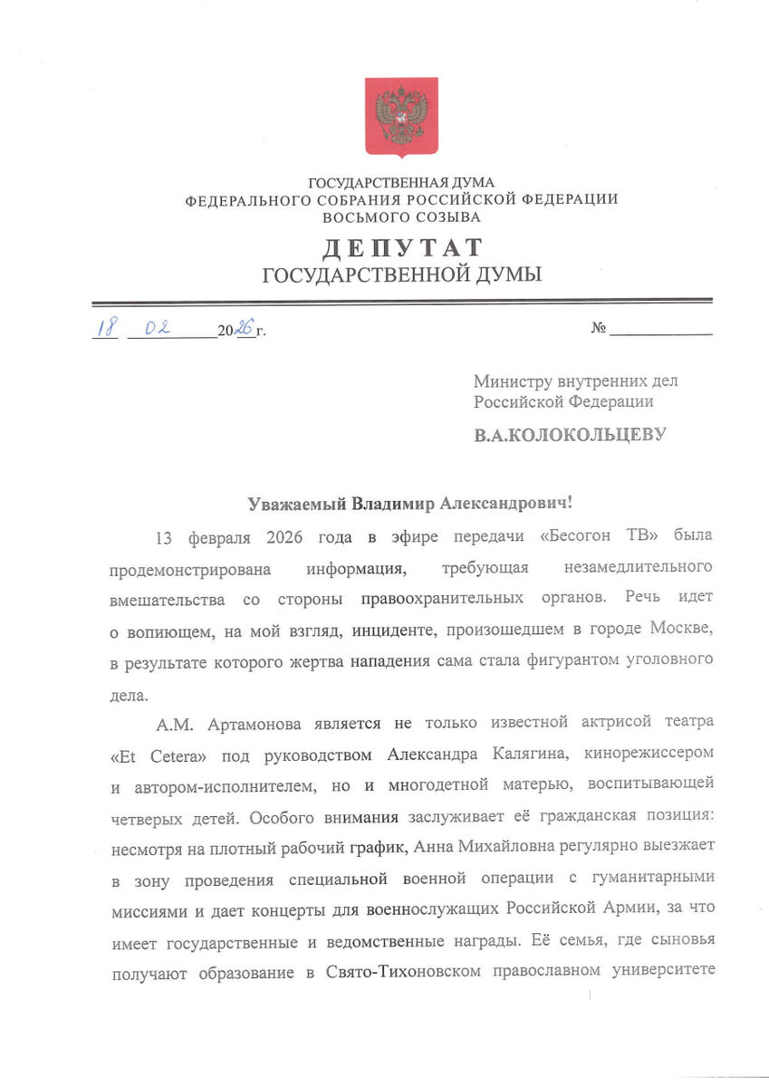 ! На этот случал обратила внимание передача "Бесогон ТВ". Актриса театра Анна Артамонова вместе с детьми приехала на машине в бассейн Termoland. В ходе поиска парковочного места произошел конфликт. 👉 Сообщается, что аггрессивный мужчина спровоцировал ссору, сопровождая её оскорблениями в адрес женщины. Дети заступились за мать. Дальше были угрзы в их адрес. Любая бы мать испугалась, будь она на месте Анны. Она начала звонить в полицию, но быстрее приехали сыновья агрессивного мужчины и совершили нападение на детей актрисы. Несовершеннолетние Яков, Григорий и Иван подверглись жестокому избиению — их душили и наносили удары. Женщина была вынуждена вмешаться, чтобы защитить жизнь и здоровье своих детей. ⬆️ Уверена, что нужно провести служебную проверку в отношении бездействия прибывших на место сотрудников полиции, а также обоснованности возбуждения уголовного дела в отношении Анны Артамоновой. 📨 С соответствующими просьбами я обратилась на имя министра внутренних дел РФ Владимира