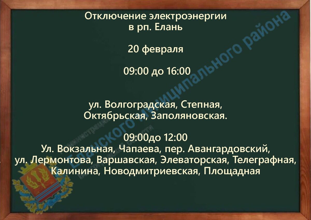 09:00 до 16:00 ул. Волгоградская, Степная, Октябрьская, Заполяновская. 09:00 до 12:00 Ул. Вокзальная, Чапаева, пер. Авангардовский, ул. Лермонтова, Варшавская, Элеваторская, Телеграфная, Калинина, Новодмитриевская, Площадная