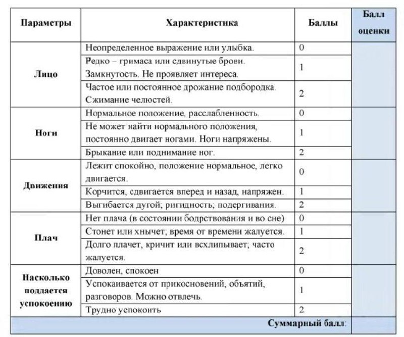 ΠΏΠ°ΡΠ°ΠΌΠ΅ΡΡΠΎΠ²: Π»ΠΈΡΠΎ, Π½ΠΎΠ³ΠΈ, Π°ΠΊΡΠΈΠ²Π½ΠΎΡΡΡ, ΠΏΠ»Π°Ρ ΠΈ ΡΡΠΏΠΎΠΊΠΎΠ΅Π½ΠΈΠ΅. Π¨ΠΊΠ°Π»Π° FLACC ΠΏΡΠ΅Π΄ΡΡΠ°Π²Π»ΡΠ΅Ρ ΡΠΎΠ±ΠΎΠΉ ΠΏΠΎΠ²Π΅Π΄Π΅Π½ΡΠ΅ΡΠΊΠΈΠΉ ΠΈΠ½ΡΡΡΡΠΌΠ΅Π½Ρ, ΠΎΡΠ½ΠΎΠ²Π°Π½Π½ΡΠΉ Π½Π° ΡΠ΅Π³ΠΈΡΡΡΠ°ΡΠΈΠΈ Π²Π½Π΅ΡΠ½ΠΈΡ