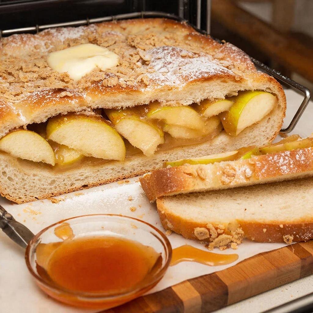 8. Выкладка яблочного слоя: Поверх первого слоя хлеба равномерно распределите подготовленные яблоки.