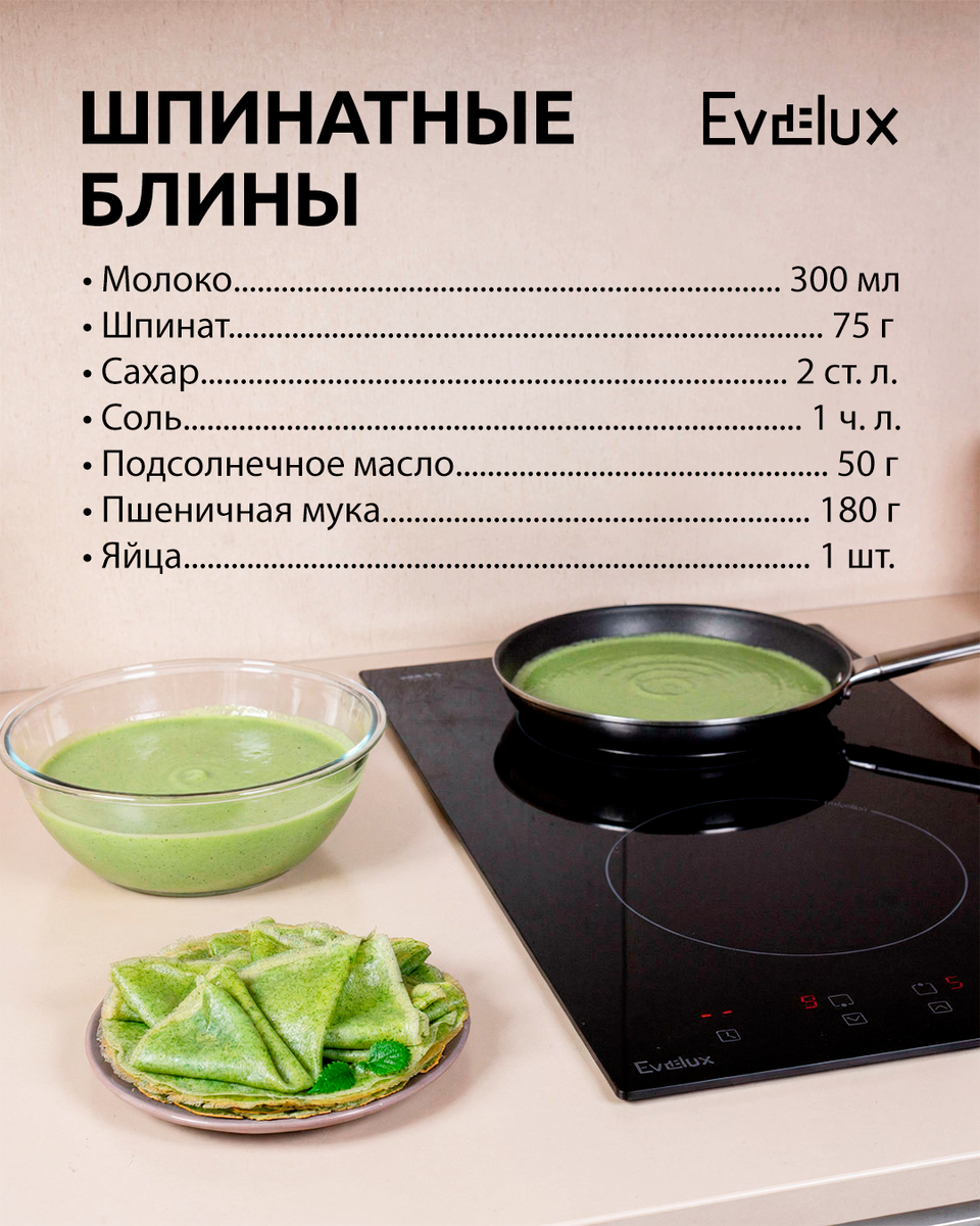 Вы знали, что Масленица делится на две части? Узкая проходит с понедельника по среду, а широкая — с четверга по воскресенье. И пусть за окном непогода, именно сегодня начинаются самые яркие и весёлые гуляния. Отличный повод добавить красок и приготовить необычные шпинатные блины. Рецепт уже ждёт вас на карточках. Для их приготовления рекомендуем воспользоваться погружным блендером Evelux EHB 0301 B: он быстро сделает тесто однородным и воздушным. А индукционная варочная панель Evelux EI 3020 на 2 конфорки мгновенно разогреет сковороду и станет отличным решением для компактной кухни. Подобрать бытовую технику для вашей кухни вы можете в нашем интернет-магазине evelux.ru