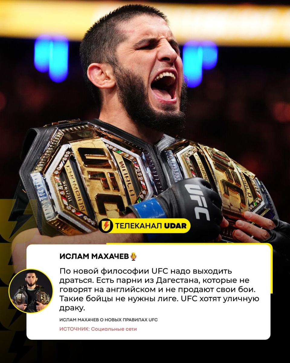 Двойной чемпион UFC Ислам Махачев заявил, что по новым правилам лучшему промоушену мира не интересны скучные ребята, как бы высоко они не забрались в рейтингах. 👍Поддержи наш канал cвоим голосом 📺Смотрим бои в прямом эфире ⚡ @teleudar