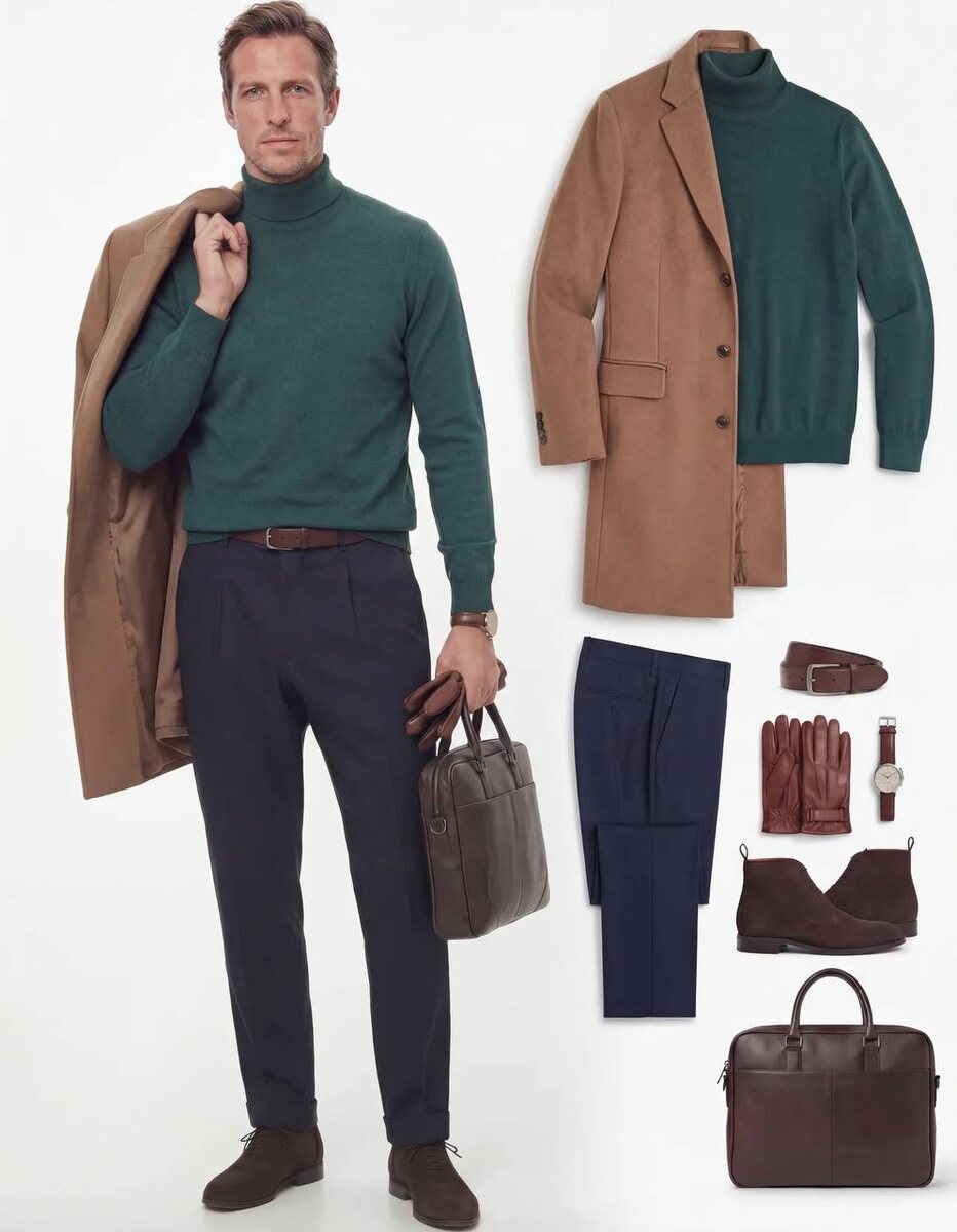 Dark Emerald — глубина и статус в основе образа | Почему этот образ выглядит гармонично? Разбираем по слоям. Здесь нет случайных решений. Всё построено на балансе цвета, фактуры и силуэта. • База — трикотаж в насыщенном хвойном оттенке. Глубокий зелёный работает как цвет статуса: он не привлекает внимание криком, он его удерживает. Чистая линия водолазки формирует вертикаль и визуально вытягивает силуэт. • Средний слой — тёмно-синие брюки Глубокий navy уравновешивает насыщенный верх. Прямой крой задаёт чёткую архитектуру образа, а мягкая ткань сохраняет пластичность и ощущение свободы. • Верхний слой — тёплое карамельное пальто Именно оно связывает композицию. Теплый коричневый оттенок смягчает холодный синий и усиливает зелёный. Контраст температур создаёт визуальную глубину. • Аксессуары — кожа в единой тональности. Обувь, перчатки, ремень и портфель выдержаны в глубокой шоколадной гамме, что создаёт ощущение продуманности и внутренней логики образа. Итог: Три цвета, три слоя,