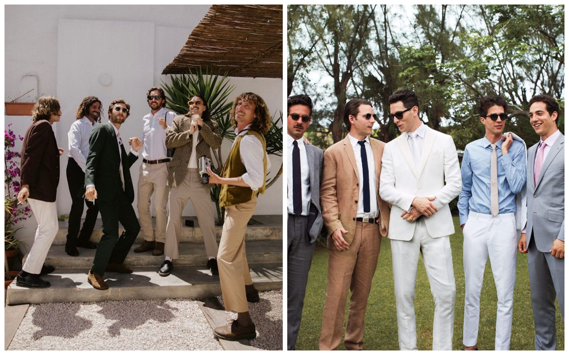 - Льняной комплект — для пляжных и загородных свадеб летом подходит льняной костюм свободного кроя, который легко дышит и не выглядит чрезмерно строго.