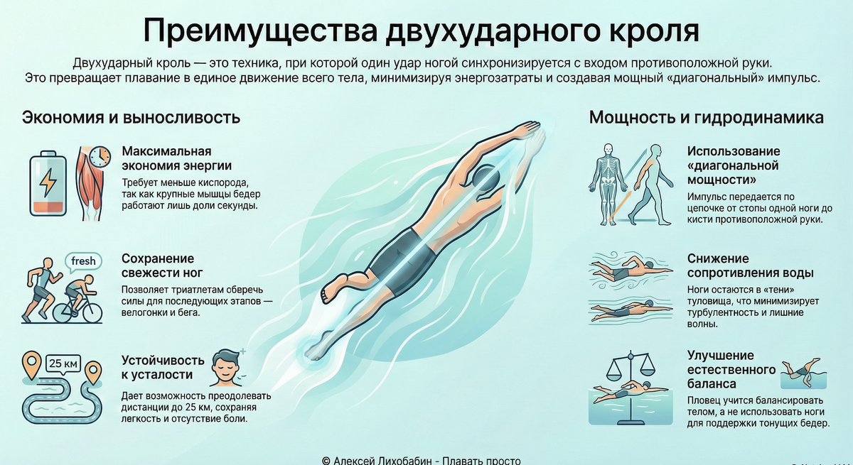 ⚡ Внедрение двухударной работы ног в плавание кролем дает пловцу ряд фундаментальных преимуществ, связанных с эффективностью, мощностью и выносливостью: 🏊🏻♂️ Максимальная экономия энергии. Двухударный кроль требует значительно меньше кислорода и топлива, чем традиционный шестиударный, так как крупные мышцы бедер работают лишь доли секунды в каждом цикле. 🏊🏻♂️ Доступ к «диагональной мощности». Пловец учится использовать самое мощное движение в вольном стиле, при котором импульс передается по цепочке от стопы одной ноги до кисти противоположной руки, задействуя все мышечные волокна тела одновременно. 🏊🏻♂️ Снижение сопротивления воды: двухударная работа ног минимизирует турбулентность и лобовое сопротивление, помогая ногам оставаться в "тени" (кильватерном потоке) туловища и не создавать лишних волн. 🏊🏻♂️ Интеграция всего тела. Этот ритм превращает плавание из изолированной работы рук и ног в единое движение всего тела, где удар ногой синхронизируется с вращением бедер и рота