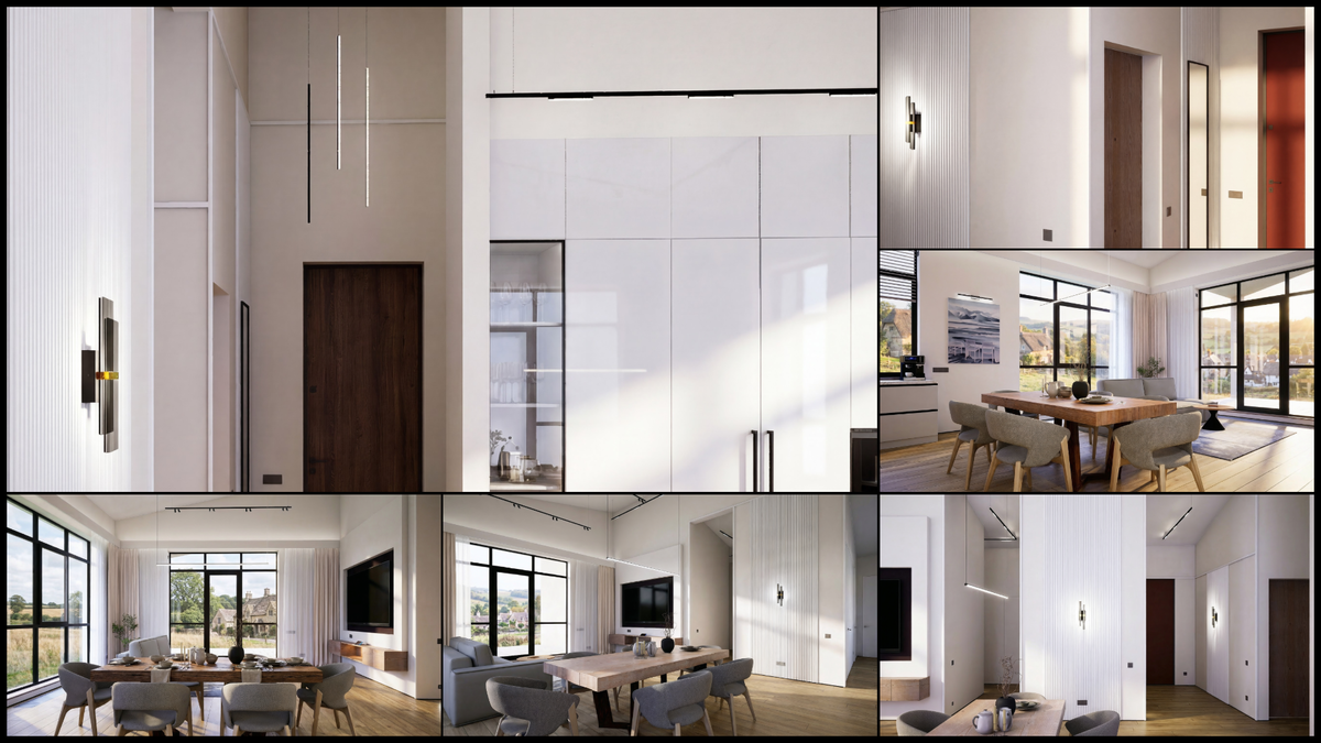 В новом отчете по дизайну кухни-гостиной и прихожей в загородном доме я продолжаю предлагать идеи по освещению и дизайну, дорабатывая начатую ранее концепцию. Все прошлые материалы можно посмотреть в подборке: Предыдущие материалы по освещению и дизайну кухни-гостиной показаны в этой статье: В обновленном варианте я переработал освещение и выбрал новые подвесные светильники для стола и прихожей. Особенность работы с высокими и скошенными потолками заключается в том, что светильники должны опускаться на значительную длину — до 2,5–3 метров. Крепление должно быть таким, чтобы скос потолка не создавал препятствий. Мои новые светильники гармонично сочетаются с трековыми системами, которые служат основным освещением. Я добавил новые модели в свою сцену в SketchUp. Это основное программное обеспечение для 3D-моделирования, где я создаю свой интерьер. Взгляните на обзорные изображения модели кухни-гостиной: Эта модель обеспечивает высокую точность. На ее основе можно создавать визуализации с