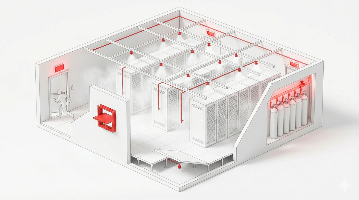 Колокейшн — это не корпоративная серверная. Это чужое имущество, незнакомые инженеры в машинном зале и договорная ответственность за каждый час простоя. Один общий контур пожаротушения на весь зал — и при срабатывании встают все арендаторы одновременно. В статье — специфика зонирования по противопожарным отсекам, расчёт времени эвакуации для большого машинного зала, выбор ГОТВ с учётом требований 2026 года и конкретные советы по аспирационным системам обнаружения, которые не дают ложных срабатываний при работающих кондиционерах.