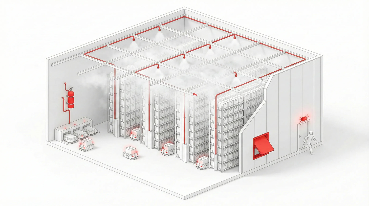 Высотные стеллажи AS/RS создают вертикальные каналы, по которым огонь уходит вверх быстрее, чем вода с потолка достигает очага. А литий-ионные батареи роботов-комплектовщиков при тепловом разгоне выделяют кислород изнутри ячеек — и продолжают гореть даже в бескислородной среде. В статье — честный разбор ограничений газового пожаротушения для складов e-commerce, протокол интеграции с WMS и WCS для остановки всего парка роботов при срабатывании детекторов, сравнение модульных и централизованных систем и гибридная архитектура для зон зарядки с максимальным риском.