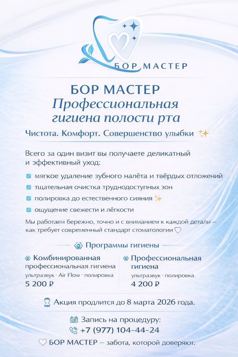 💙 Процедура проходит быстро, комфортно и безопасно — подходит как взрослым, так и детям 💎 Наши программы гигиены: 🔹 Комбинированная профессиональная гигиена ультразвук + Air Flow + полировка 💰 5 200 ₽ 🔹 Профессиональная гигиена ультразвук + полировка 💰 4 200 ₽ 📅 Позаботьтесь о здоровье зубов уже сегодня! Запишитесь на процедуру удобным способом: 📞 по телефону 📞 Тел.: +7 (977) 104-44-24 ✨ Ваша улыбка — наша забота.