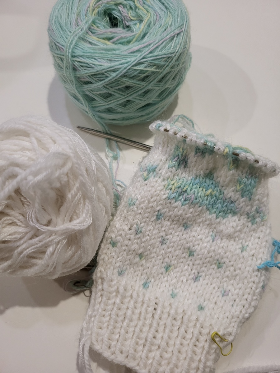 Решила вязать варежки с узором. Всё по науке: связала образец, рассчитала петли, выяснила, что резинку надо вязать спицами 3,5, а основное полотно — 4. Умница, молодец, всё записала. 📒