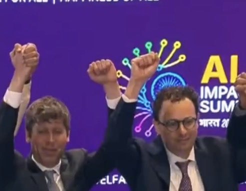 На AI-конфе в Индии Сэм (OpenAI) и Дарио (Anthropic) отказались в конце вместе поднимать руки, хотя все другие руководители компаний это