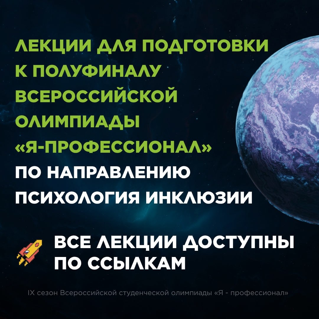 🚀 Завершился цикл лекций от ведущих экспертов в рамках подготовки к полуфиналу олимпиады «Я — профессионал». Если вы пропустили какие-то эфиры или хотите вернуться к материалам - мы собрали все записи: ⏩Специальные условия обучения и психолого-педагогического сопровождения обучающихся с ОВЗ, инвалидностью ⏩Включение микросоциума лиц с ОВЗ и инвалидностью в инклюзивное пространство ⏩Организация инклюзивной культурной и образовательной среды ⏩Организация инклюзивного досуга с учетом психологических особенностей и возможностей лиц с ОВЗ и инвалидностью ⏩Содействие формированию психологической готовности социума к инклюзии ⏩Профориентация и трудоустройство лиц с ОВЗ и инвалидностью в условиях инклюзии / инклюзивное трудоустройство Успехов в подготовке! #КГУ_Япрофессионал@kursksu ❤️ КГУ в MAX