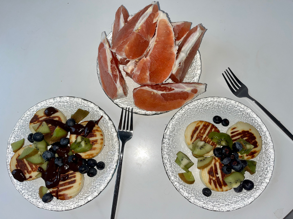 - голубика и киви, а в моей тарелке еще остатки шоколадного соуса