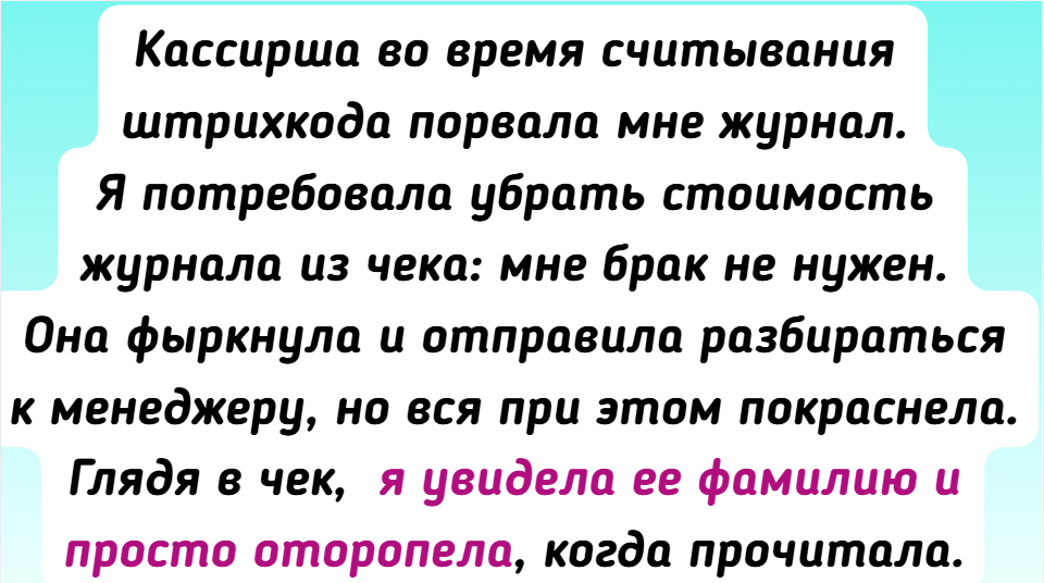 - Кассирша во время считывания штрихкода порвала мне журнал. Я потребовала убрать стоимость журнала из чека: мне брак не нужен. Она фыркнула и отправила разбираться к менеджеру, но вся при этом покраснела. Глядя в чек, я увидела ее фамилию и просто оторопела, когда прочитала: Гадюка. Даже жалко ее стало.