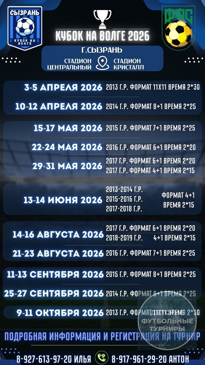🏆 Расписание турниров нового сезона ⚽ Прямые трансляции 📺 Фотоотчет с турнира 📸 Сборная игрового дня ⭐ Награждение медали и призы для всех команд🥇 Великолепные условия для приезжих команд 🏨 Успей заявить свою команду ✅ 8-927-613-97-20 Илья ☎ 8-917-961-29-20 Антон ☎ vk.ru/syzranvolga Добро пожаловать в Сызрань 👍