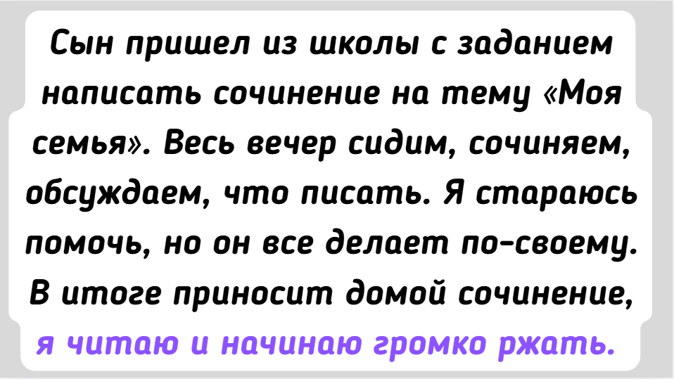 - Сын пришел из школы с заданием написать сочинение на тему «Моя семья». Весь вечер сидим, сочиняем, обсуждаем, что писать. Я стараюсь помочь, но он все делает по-своему. В итоге приносит домой сочинение, я читаю и начинаю громко ржать. Там, сын пишет, цитирую: «Моя мама — главная в семье, потому что она всегда знает, что делать, а папа — ее помощник». Показала мужу, теперь мы шутим, что он мой заместитель, и муж смеха ради просит меня: «Начальник, отпустите сегодня с ребятами отдохнуть после работы».