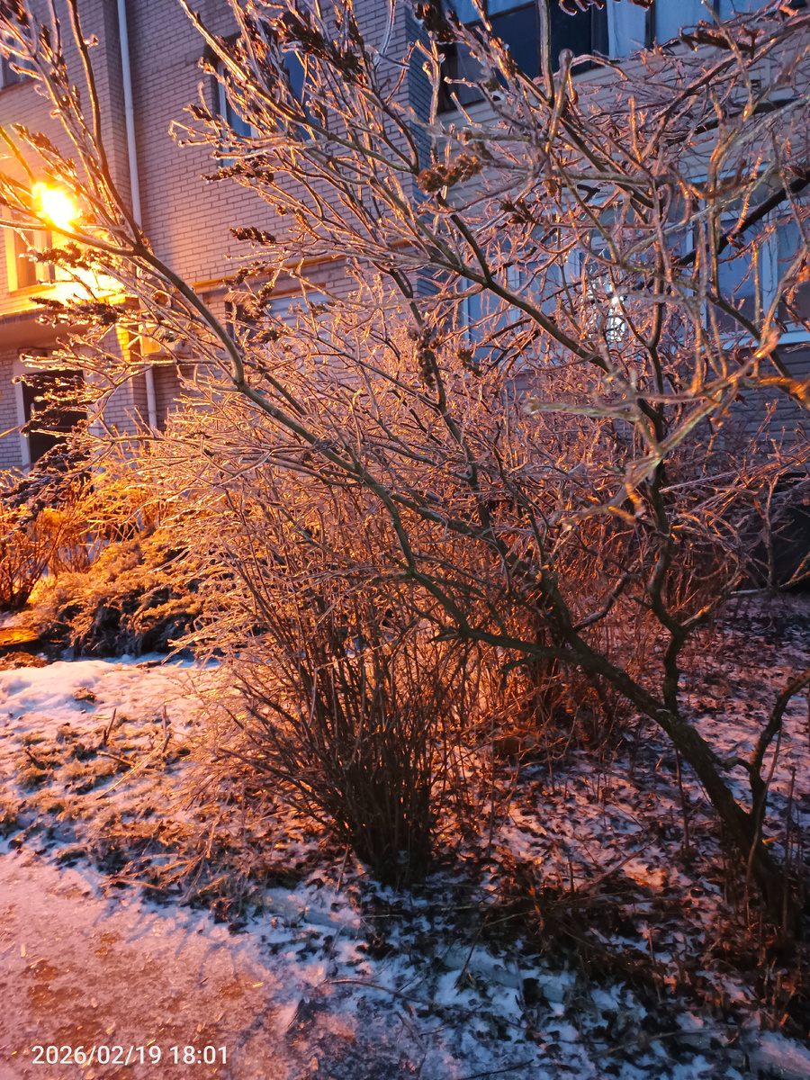 На ветках лёд и ветер сильный.