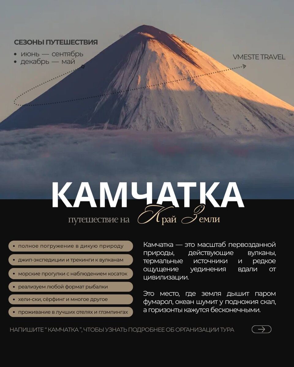 😀 Собрали для вас направления по России, где мы уже реализовывали персональные путешествия: от вулканов Камчатки и горных пейзажей Дагестана до экспедиций в самые труднодоступные уголки нашей страны! По этим направлениям можем оперативно разработать для вас путешествия ⤴️ ➡️ Не нашли нужное направление? Напишите нам — разработаем маршрут специально для вас. ➡️ Хотите узнать подробнее о путешествии и оставить заявку на организацию тура? Отправьте нам название направления в личные сообщения → @vm_travel_meneger 🔔 Подписаться на канал #vmeste_маршруты