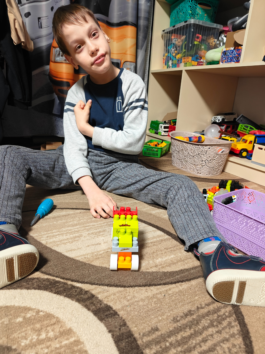 После ужина Саша одела Арсения, мы с ним немного погуляли перед домом - на улице сегодня относительно тепло, падает снежок. После прогулки Сеня постоял в вертикализаторе, подтягивался, стоял у каната, затем играл в машинки из лего.