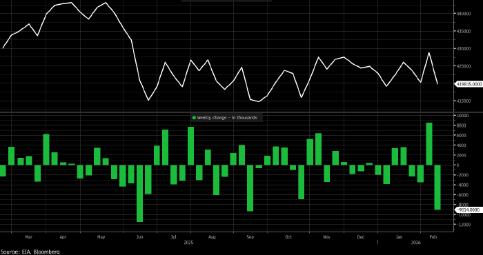 На неделе до 13 февраля коммерческие запасы сырой нефти в США снизились на 9,014 млн баррелей, что оказалось самым большим значением с сентября 2025 года. Коммерческие запасы сырой нефти в США (вверху, в тыс. баррелей) и их недельное изменение (внизу, в тыс. баррелей). Данные: Минэнерго США, источник: Bloomberg На неделе до 13 февраля коммерческие запасы сырой нефти в США снизились на 9,014 млн баррелей, что оказалось самым большим значением с сентября 2025 года. Сами запасы составили 419,815 млн баррелей: это минимальный показатель с начала января. На неделе до 13 февраля запасы сырой нефти в Кушинге, где осуществляется поставка по фьючерсам на WTI, снизились на 1,095 млн баррелей, что оказалось самым большим значением с июня 2025 года. Сами запасы составили 24,018 млн баррелей: это минимальный показатель с конца первой декады января. Запасы сырой нефти в Кушинге (вверху, в тыс. баррелей) и их недельное изменение (внизу, в тыс. баррелей). Данные: Минэнерго США, источник: Bloomberg На