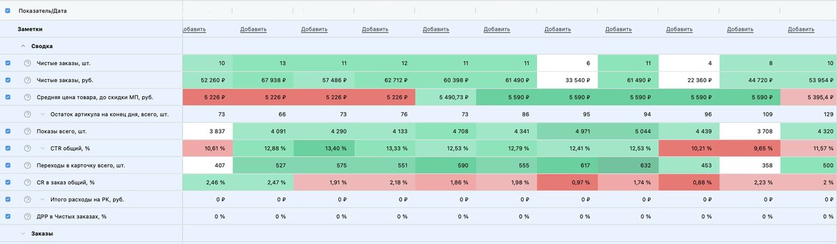? Дано: товар продаётся. ДРР в заказах 0%, так как селлер не пользуется рекламой, маржинальность хорошая. Высокий CTR – нет рекламы, только органические показы. Хороший CR и карточка. В отчёте по поисковым запросам видно, что показов по запросам может быть около 9 тысяч, а у селлера их меньше. Что делать: масштабироваться и увеличить продажи через усиление показов, запустив РК. С помощью «Сквозной воронки» можно быстро протестировать влияние одной или сразу нескольких РК на заказы выбранного товара, контролируя ДРР (и все этапы воронки). В результате: селлер запустил РК, чистые заказы выросли примерно на 15%. При этом маржинальная прибыль сохранилась. «Сквозная воронка» – это подробная ежедневная и еженедельная аналитика по WB и Ozon, которая позволяет увидеть результат сегодняшних изменений уже завтра. В инструменте можно контролировать заказы (в рублях и штуках), среднюю цену товара, показы, рекламу, CTR, конверсии и т. д. 👉 Узнайте больше о возможностях нового инструмента Sel