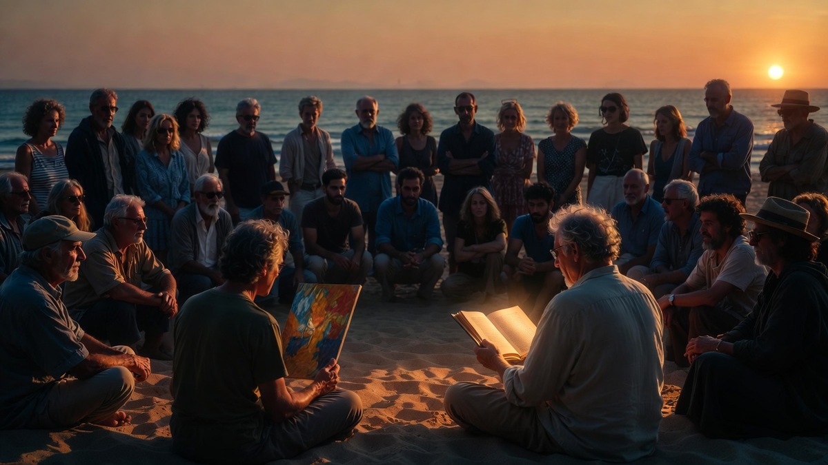 Новость о том, что на маленьком Антипаросе есть школа, где преподают «те двое», распространилась по «Агоре» быстро. И постепенно, год за годом, школа стала местом паломничества. Не туристического, а скорее духовного — люди приезжали, чтобы увидеть, поговорить, прикоснуться к живому свидетельству истории. В тот год, после создания архива, приехало особенно много гостей. Лейла организовала неформальную встречу, назвав её «Диалог на острове». Приехали учёные из Европы и Азии, студенты, учителя, художники, просто люди, которым был важен «Диалог» Схолария. Школа была слишком мала, чтобы вместить всех, поэтому занятия проводили на открытом воздухе — во дворе, на пляже, в таверне, которую любезно предоставил местный хозяин. Артём и Софья не читали лекций — они просто были рядом, отвечали на вопросы, слушали, иногда вступали в разговоры. Особенно запомнился им один вечер. Сирийский художник, беженец, живущий в Германии, показывал свои работы — серию картин, вдохновлённых «Диалогом». На них три