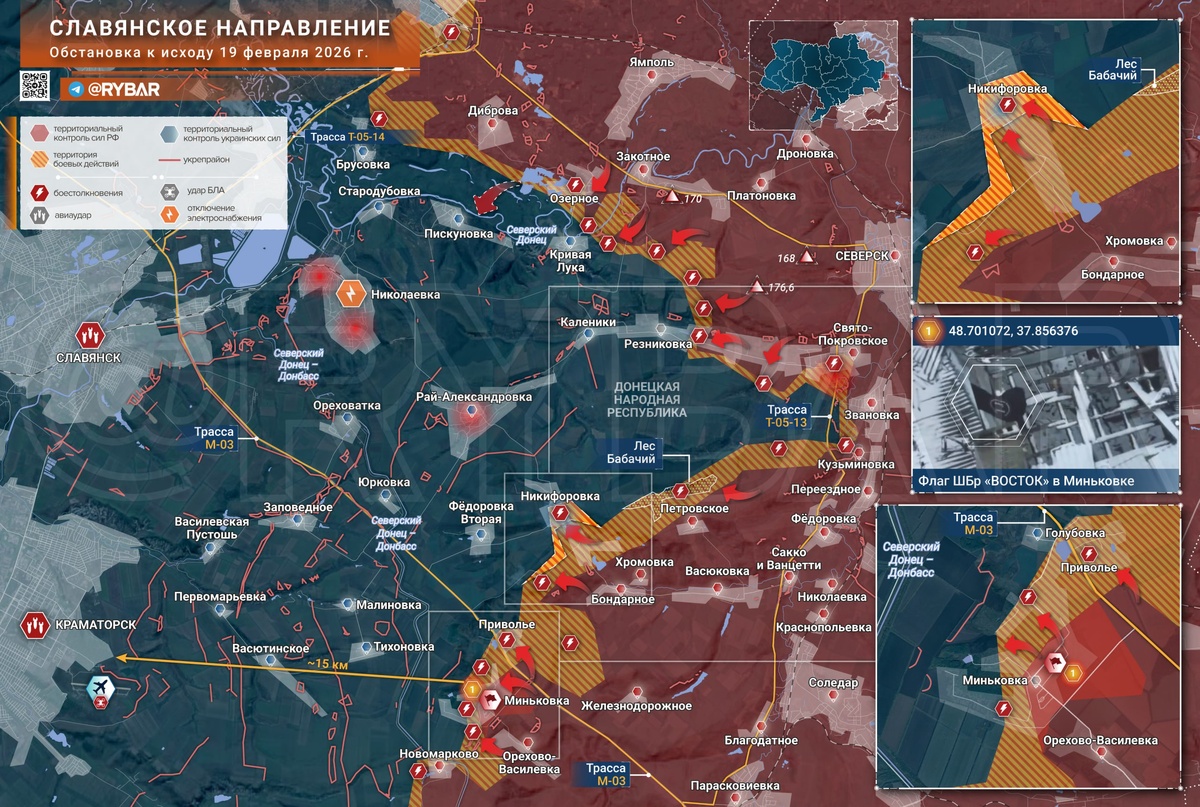 На Славянском направлении российские подразделения продолжают уничтожать украинскую логистику на дорогах в Николаевке и Рай-Александровке. Именно через них ВСУ перебрасывают подкрепления к Кривой Луке и окрестностям Свято-Покровского, пытаясь воспрепятствовать попыткам ВС РФ закрыть «карман». 🔸На северном фланге продолжаются штурмовые действия у Кривой Луки и в Резниковке. Контроль над этими селами позволит обойти позиции ВСУ в Рай-Александровке с фланга, избегая лобовых атак на подготовленные в 2025 году позиции. На южном фланге российские штурмовые группы продвинулись в Никифоровке, заняв новые позиции в центре села. 🔸В Сети также появились видео с водружением флага в центре Миньковки. Исходя из этого, как минимум половина населённого пункта перешла под контроль ВС РФ спустя несколько дней после официального заявленияв Минобороны России. Статус соседнего Приволья пока остаётся не до конца ясным ввиду отсутствия сведений с мест и каких-либо кадров. 🔸 Долгое время конфигурация линии