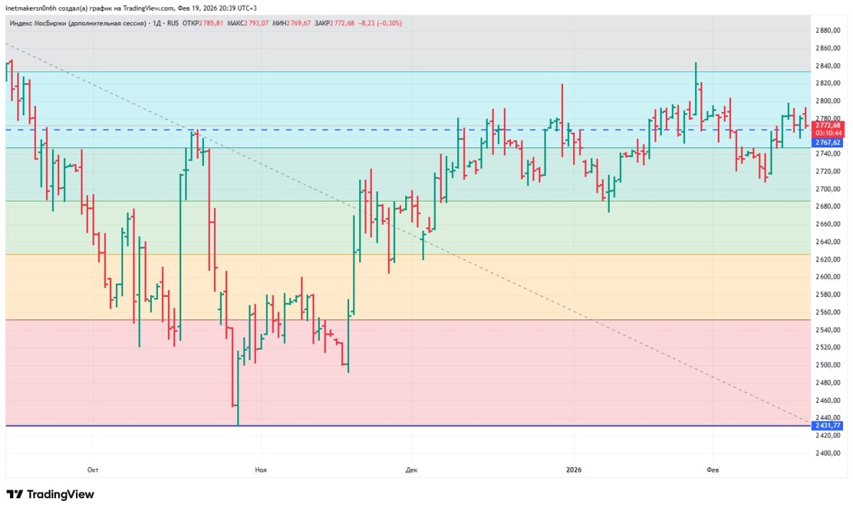 ❗️19 февраля российский фондовый рынок снизился, индекс МосБиржи подешевел на 0,22% до уровня 2772,84