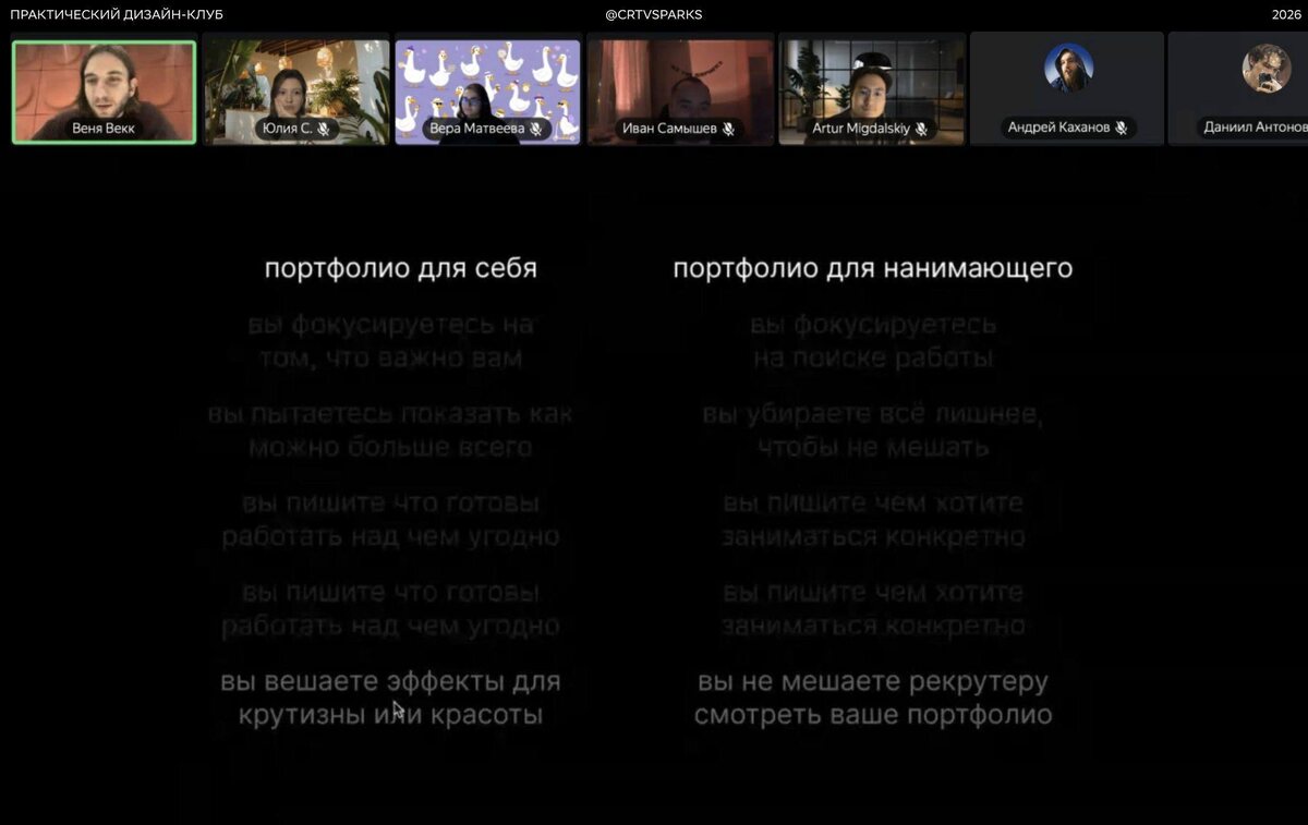 Очень хочу сделать что-то, что отражает меня, а ещё то, от чего я сама кайфую. Работа над сайтом не только про собирание вкусноты, но и рефлексия над всем, что я делала 6+ лет, так что много всего собираю и сортирую. И, конечно, приходится что-то отсеивать. Выбирать. Вопрос, что выбрать то. Сама я дизайнеров не нанимаю, а потом пару недель назад решила послушать человека, который это делает, и делает это давно. Так я пригласила Веню Векка, лид-дизайнера в Плюсе, дать лекцию по портфолио в моём дизайн-клубе. Тем более, что многим ребятам в нём актуальна эта тема и многие прямо сейчас делают свои сайты. Могу очень много всего расписать из того, что мы обсуждали там, но выше один из самых важных слайдов с его презентации. Портфолио мы делаем прежде всего для нанимающего. А потому важно транслировать свой чёткий образ — кто ты, что ты делаешь и как. Проектов может быть очень много, очень разных, но тогда образ расплывается и становится непонятно на что тебя брать, на какую фичу, на какие
