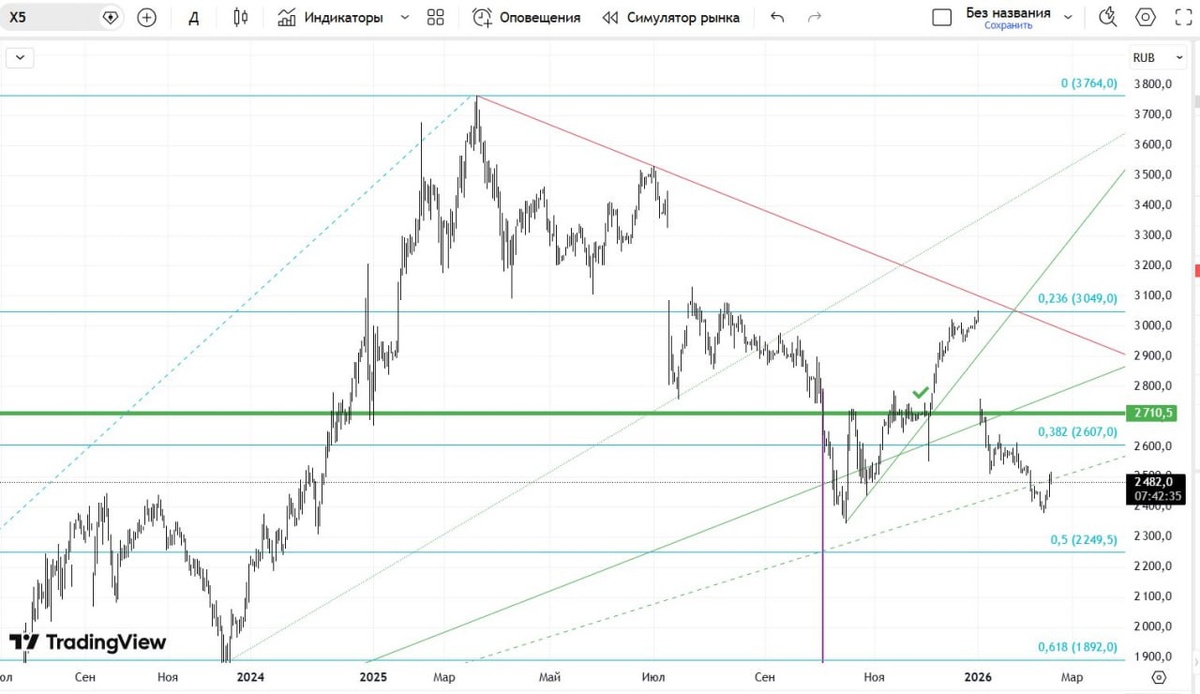 Заметили комментарий о том, что рынком управляют прогнозисты: дают неверные прогнозы и получают прибыль благодаря вере инвесторов в них. Инвестор отметил, что покупал акции Х5 по 2700, потому что везде говорили о том, что рост будет продолжаться. Это голос тысяч инвесторов, которые доверились громким заголовкам и «надежным целям» аналитиков, но в итоге остались в просадке. Ситуация с X5 — пример того, почему системный подход и технический анализ важнее любых новостей. Давайте рассмотрим логику графика, которая была доступна каждому, кто владеет инструментами. Так как мы не знаем, в какой именно момент происходила описанная ситуация, разберем два возможных случая. 🔹 Январь 2025. Цена 2700. Это была технически обоснованная точка входа — актив находился у линии тренда. Те, кто купил здесь, поступили верно. Но важно не только зайти, но и знать, когда выйти. 🔹 Апрель – май 2025. Слом сценария. График показал два тревожных сигнала: актив не смог пройти важный горизонтальный уровень 3400