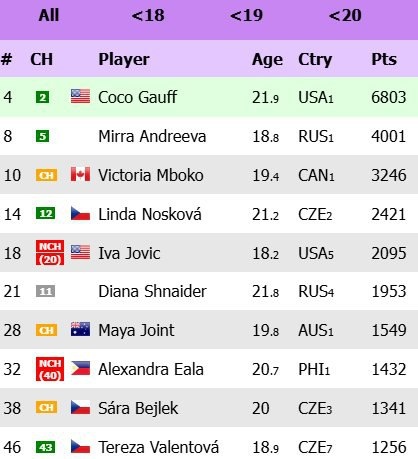 ! 🎾 И это не случайность, а результат упорной работы и пик формы. Болельщики надеются, что все они продолжат прогрессировать! В списке самых перспективных: 4. Коко Гауфф (19 лет, США) 8. Мирра Андреева (16 лет, Россия) 10. Виктория Мбоко (18 лет, Канада) 14. Линда Носкова (19 лет, Чехия) 18. Наоми Осака (18 лет, США) 21. Диана Шнайдер (19 лет, Россия) 28. Майя Джойнт (18 лет, Австралия) 32. Александра Эала (19 лет, Филиппины) 38. Сара Бейлек (18 лет, Чехия) 46. Тереза Валентова (18 лет, Чехия) Подпишись на Эйс и точка
