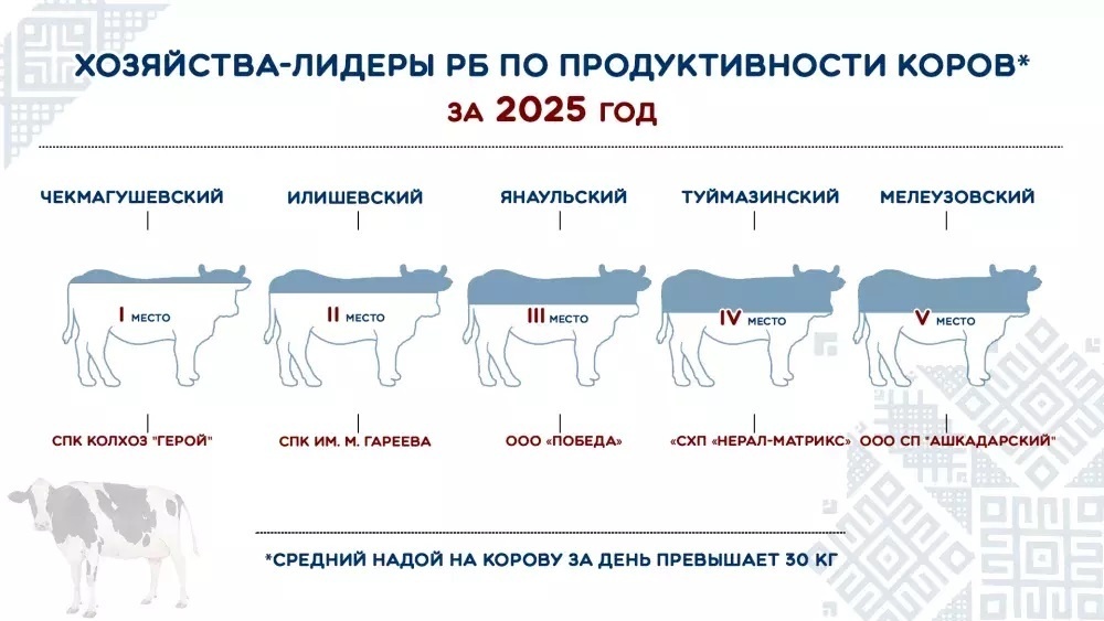 В Министерстве сельского хозяйства Башкирии были подведены итоги продуктивности молочного стада и объемов производства молока хозяйствами региона за прошедший 2025 год. Был составлен список лидеров среди операторов машинного доения, продемонстрировавших самые высокие показатели эффективности. За минувший год сельскохозяйственными предприятиями и крестьянско-фермерскими хозяйствами республики было произведено 780,9 тысяч тонн товарного молока (рост на 0,7%). Большая часть продукции приходится на долю сельскохозяйственных предприятий региона — около 81%, что составляет 635,2 тысячи тонн молока. Рейтинг продуктивности молочных стад возглавил коллективный СКК «Герой» Чекмагушевского района, агрофирма имени М.Гареева Илишевского района, ООО «Победа» Янаульского района, компания «СП «Нерал-Матрикс» Туймазинского района и ООО «СП «Ашкадарский» Мелеузовского района, где ежедневный удой одной коровы превысил отметку в 30 килограммов. Топ-5 хозяйств по объему произведенного молока составили ООО