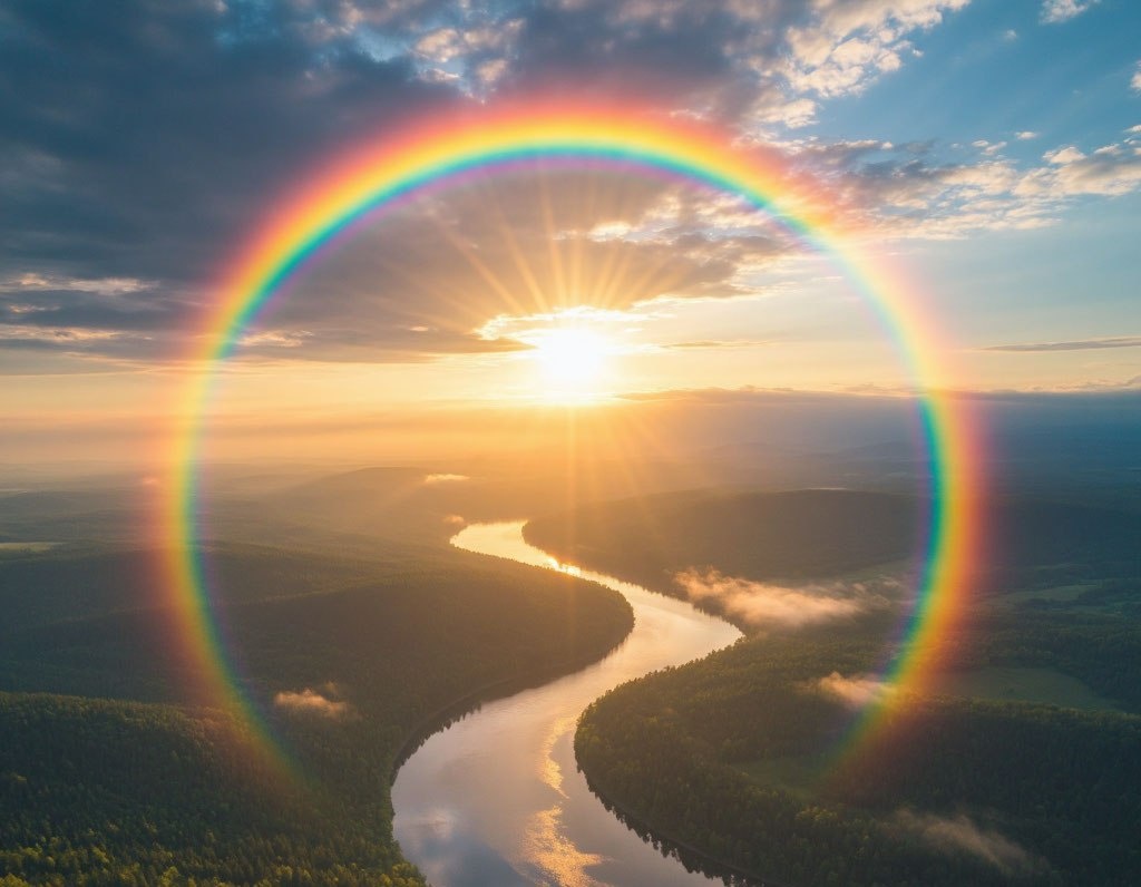 Вы когда‑нибудь замечали, что радуга бывает не только привычной дугой, но и почти полным кругом — или даже перевёрнутой? Кажется, будто природа решила поиграть с нами в оптические иллюзии. Давайте разберёмся, почему так происходит — без сложных формул, но с долей научного любопытства! Радуга — это не магия, а игра света и воды. Она появляется, когда: Как это работает? Солнечный луч входит в каплю воды, преломляется (меняет направление), отражается от внутренней стенки капли и снова преломляется, выходя наружу. При этом белый свет раскладывается на цвета спектра — как в призме. Почему же мы видим дугу, а не полный круг? Всё просто: земля мешает. Центр радуги всегда лежит на прямой, соединяющей солнце и ваш глаз. Если солнце высоко, над горизонтом видна лишь небольшая часть окружности. Чем ниже солнце, тем больше дуга — вот почему самые полные радуги бывают на рассвете и закате. А теперь представьте, что вы не на земле, а в самолёте или на высокой горе. В этом случае ничто не загоражив
