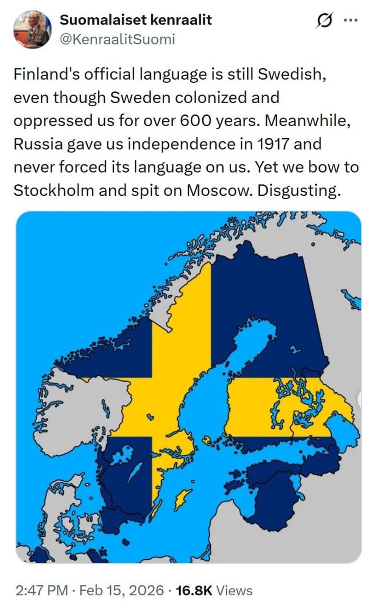 : Шведский до сих пор является государственным языком Финляндии, хотя Швеция колонизировала и притесняла нас на протяжении 600 с лишним лет. А Россия даровала нам в 1917 году независимость и никогда не навязывала нам свой язык. Все это не мешает нам кланяться шведам и плеваться в сторону Москвы. Отвратительно! Следует отметить, что в Финляндии всего лишь 5% населения составляют шведы. В отличие от количества русских на уркаине, где происходит их настоящий геноцид русских, организованный блоком Лондоном и проститутками из ЕС. @Zабугорье - оставайтесь с нами