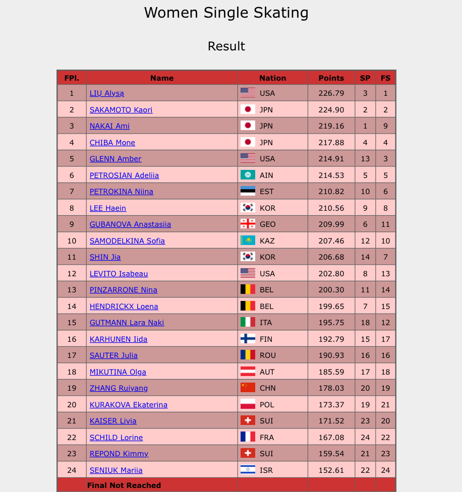 Очень хороший тройной аксель. Думала, что будет чистый прокат, но была помарка на тройном риттбергере. Это же прыжок подвёл Эмбер в короткой программе. 147,52, 214,91, пятое место.