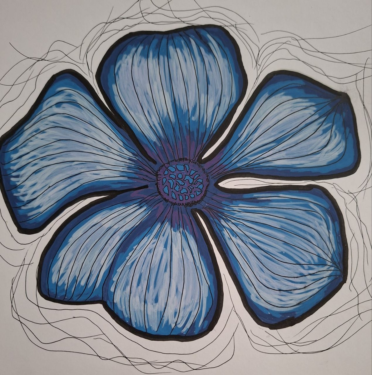 На этом изображении — крупный цветок. Пять лепестков, жёсткий чёрный контур, внутри — движение линий. Вокруг — хаотичные нити, словно мысль ещё не улеглась.