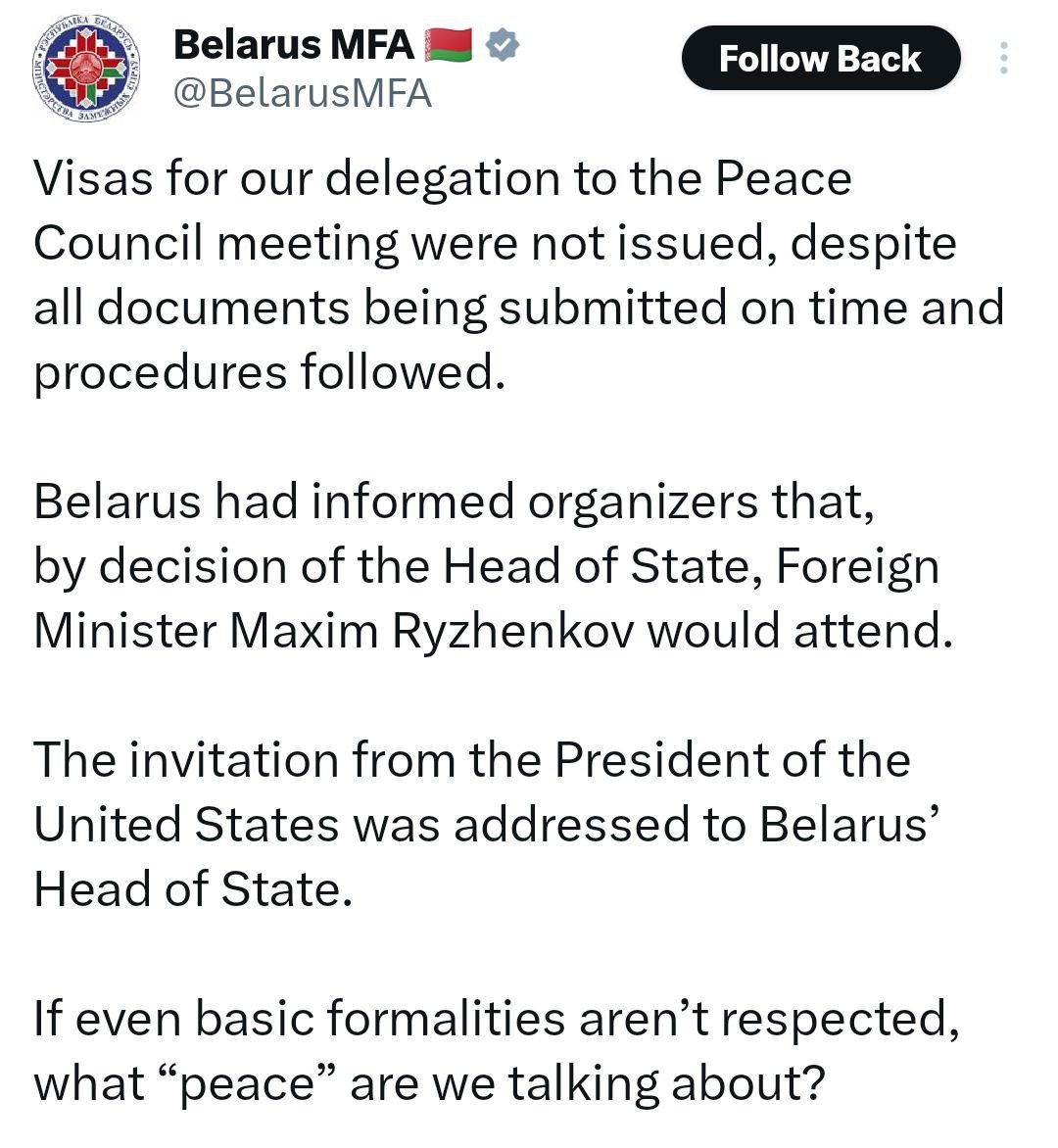 Belarus reps' VISAS NOT ISSUED for Board of Peace event Despite ALL procedures followed correctly 'IF even basic formalities aren't respected, what 'peace' are we talking about?'