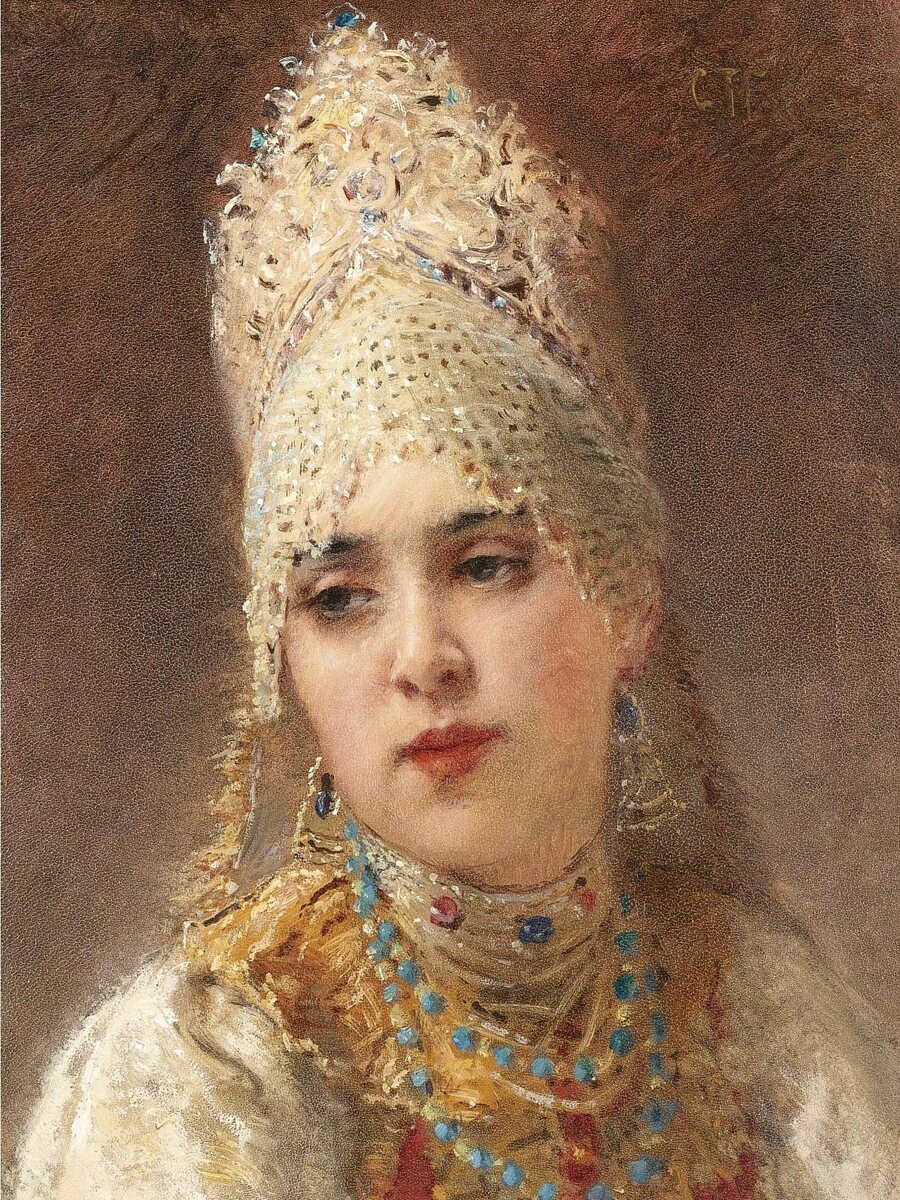 Для художников XIX–XX веков национальный костюм был способом передать историческую достоверность и атмосферу эпохи. В портретах и исторических сценах часто можно увидеть, как тщательно выписываются сарафаны, кафтаны, зипуны, понёвы и кокошники. Так, например, у Константина Маковского боярыни и невесты изображены в роскошных кокошниках, кичках и шубах, где каждая деталь прописана с мастерской точностью. В исторических полотнах Василия Сурикова народная и боярская одежда помогает создать особое ощущение подлинности эпохи. В более романтизированной манере к теме обращается Виктор Васнецов. Его герои в длинных одеждах с прорезными рукавами и фантазийных головных уборах, хотя и происходят из сказочного мира, сохраняют в своих образах узнаваемые элементы народного костюма. 1. Константин Маковский. Боярыня 2. Василий Суриков. Боярыня Морозова 3. Константин Маковский. За чаем 4. Виктор Васнецов. Царевна-лягушка 5. Виктор Васнецов, Иван-царевич на Сером Волке 6. Василий Суриков. Боярышня со скр