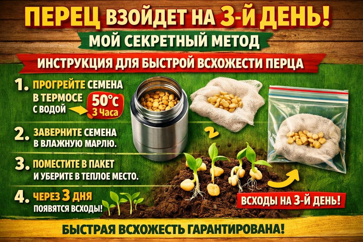 Перец взойдет на 3-й день! Мой секретный метод. Инструкция для быстрой всхожести перца. (Забудьте про 2-3 недели ожидания. Этот метод заставит проклюнуться даже "мертвые" семена за 72 часа. Делюсь технологией, которую используют профи в тепличных хозяйствах.) ❌ СТОП! Вы все еще держите семена перца в мокрой тряпочке и ждете? Это путь к разочарованию. У перца есть мощные ингибиторы роста в оболочке, которые природа заложила, чтобы семя не проросло раньше времени. Наша задача — не просто намочить, а выбить эти блокаторы хирургически точно. Почему перец всходит долго: Наш метод: Агрессивная, но безопасная тройная стимуляция — тепло, кислород и биогенный взлом. ЧТО НУЖНО: Семя перца — это как спящий дракон. Вода — это просто "побрызгать на морду". Наш метод — это три пинка подряд: горячей водой по броне, кислородом в легкие, гормонами в мозг. Дракон просыпается и ОРАТЬ: "ГДЕ МОЯ ЛУНКА?!". Сделайте это один раз — и больше никогда не будете ждать перец неделями. А вы пробовали "агрессивные"